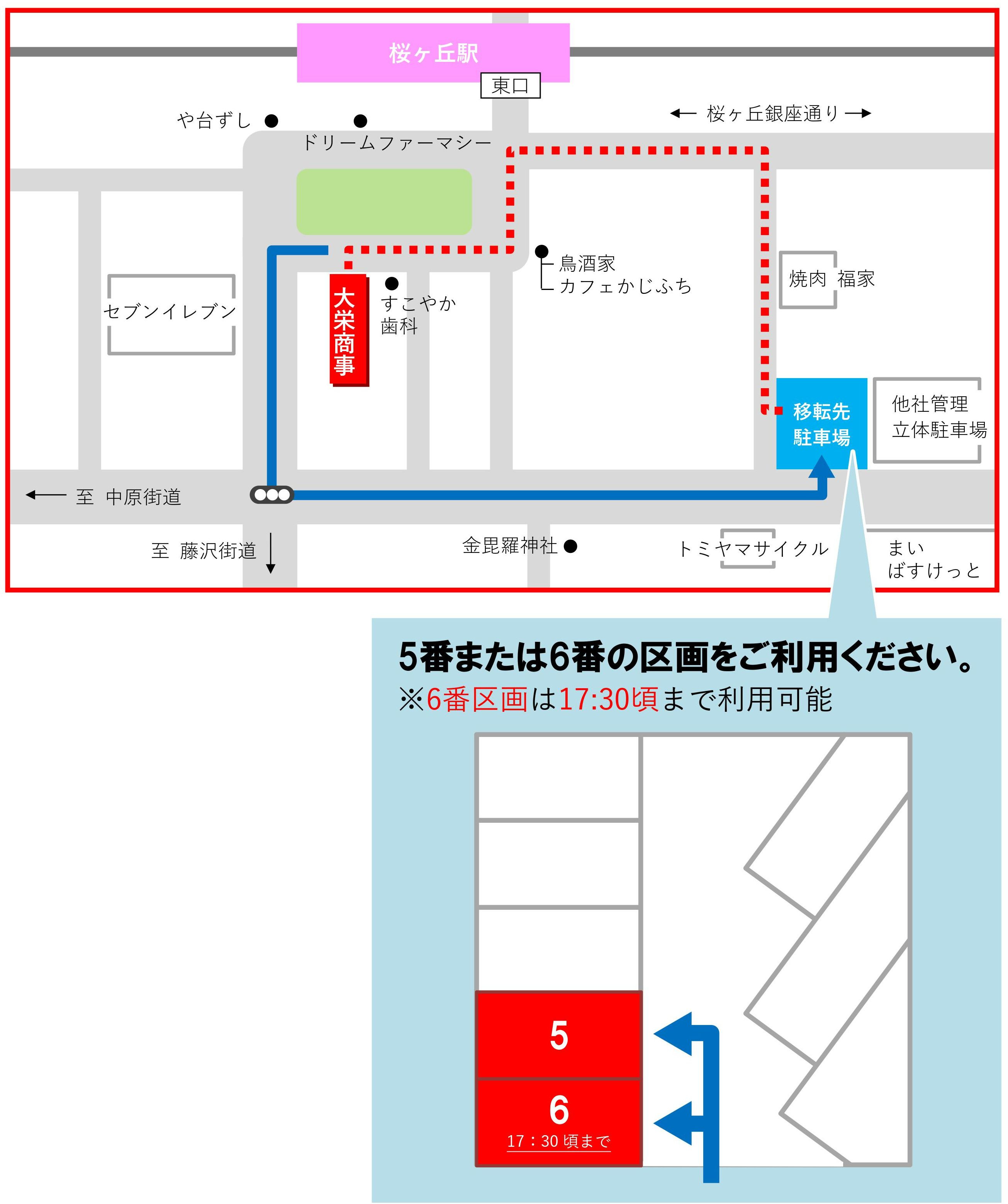 また、移転先駐車場の場所が分かりづらい場合は、お手数ですが弊社スタッフにお声がけくださいますようお願いいたします。